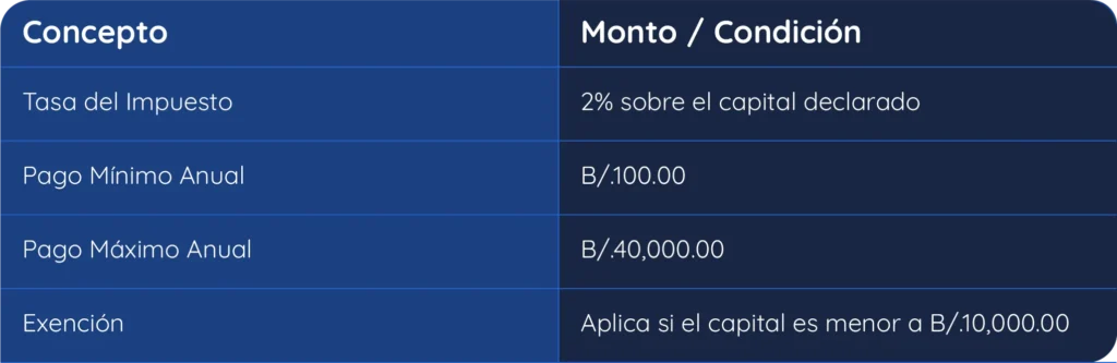 Este representa la tasa anual que se paga por mantener el aviso activo. Su cálculo corresponde al 2% sobre el capital declarado de la empresa o negocio, con topes mínimos y máximos para equilibrar la carga fiscal. Veamos de qué se trata en el siguiente cuadro.